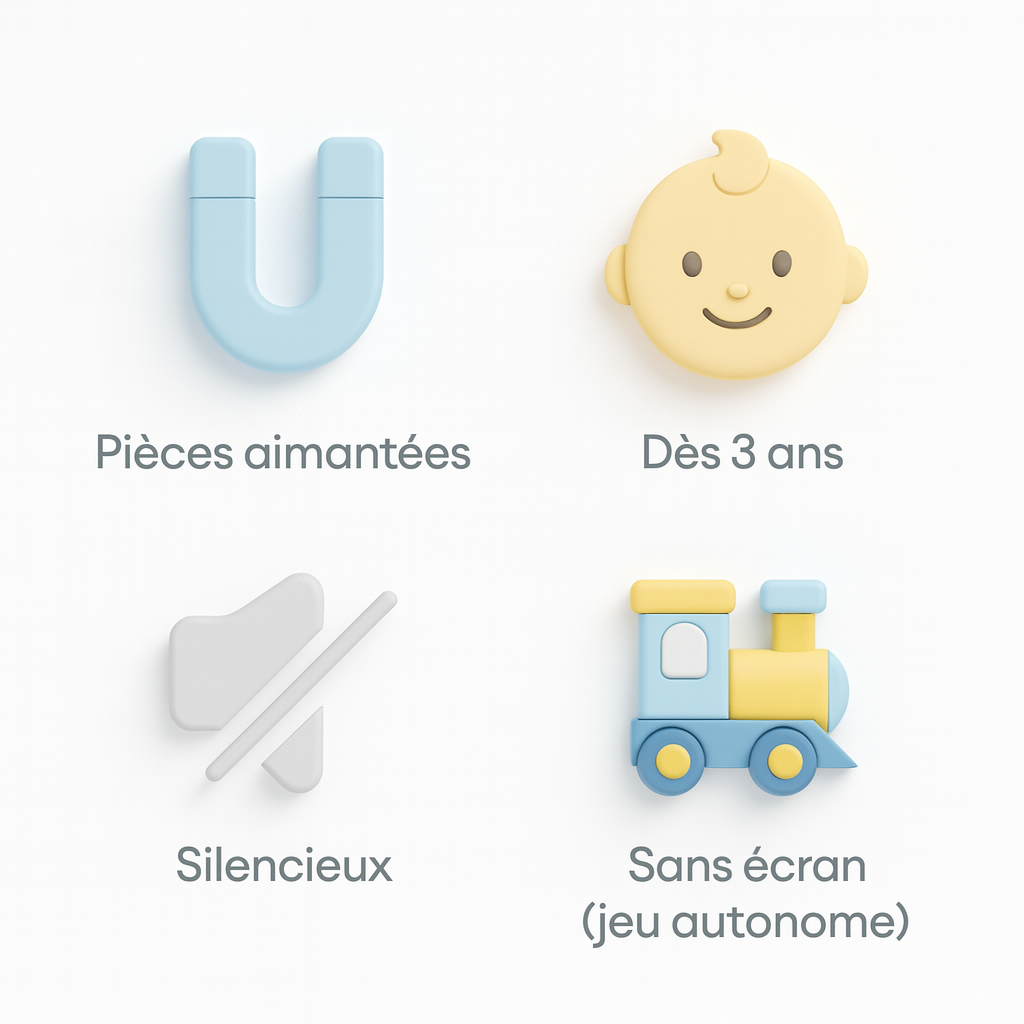Les trains glissent en silence et l’ensemble est conçu pour un jeu calme, idéal à la maison ou avant le coucher.